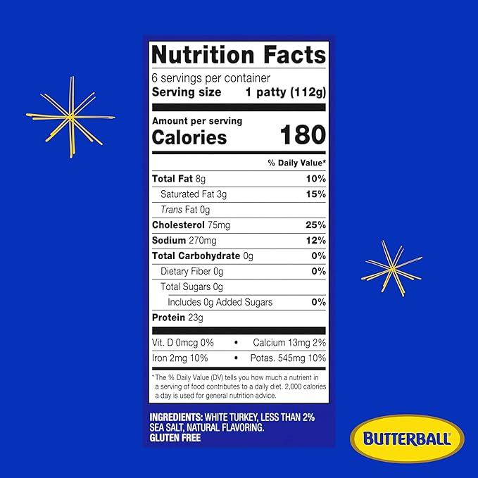 - •Includes six 1/4 lb. Butterball All Natural White Frozen Turkey Burger Patties